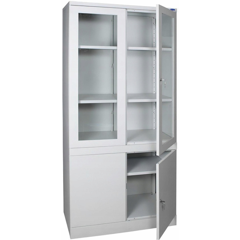 Wielofunkcyjna szafa posiada przeszklony górny przedział oraz dolną część z pełnymi metalowymi drzwiami. Taki układ umożliwia bezpieczne przechowywanie delikatniejszych przedmiotów w dolnej sekcji, jednocześnie zapewniając łatwy dostęp do zawartości górnej części.Specjalistyczne meble zostały zaprojektowane z uwzględnieniem wymagań bezpieczeństwa. Produkt jest certyfikowany i odpowiada międzynarodowym standardom jakości.